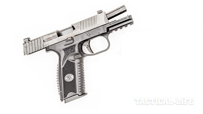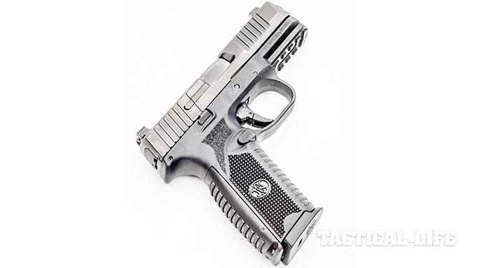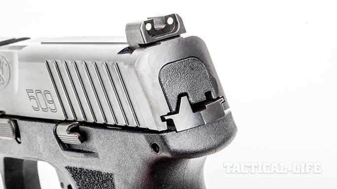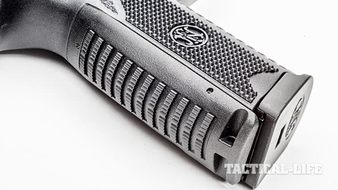 The slide’s cocking serrations are deeper and cover a great deal of surface area, both fore and aft, to provide the user a more positive grip when charging the chamber or unloading the pistol. FN engineers also included an external extractor that pulls double duty as a visual and tactile loaded-chamber indicator.