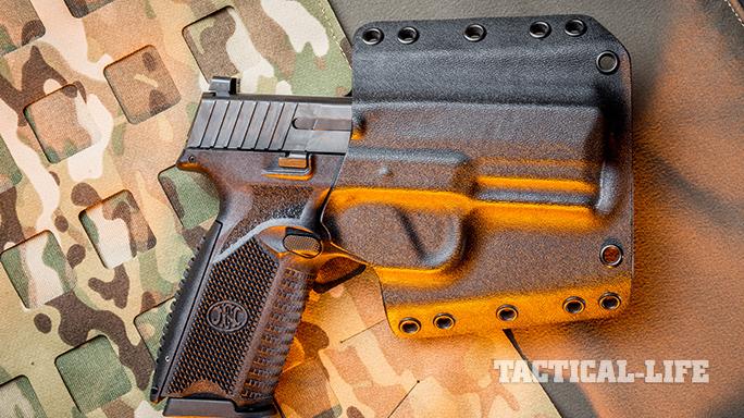 There are a number of other frame features that I found particularly favorable. The tang or beavertail area of the gun has a great design. It is proportioned to protect the hand from being “bitten” by the reciprocating slide. Subtle polymer fences around the slide and magazine releases, as well as the takedown lever, prevent inadvertent activations of any of these controls. FN also elongated the triggerguard, making the pistol safer to shoot while wearing gloves. The extra-large triggerguard also presents an excellent opportunity for holster makers to use the forward portion of the guard opening to create a friction lock.