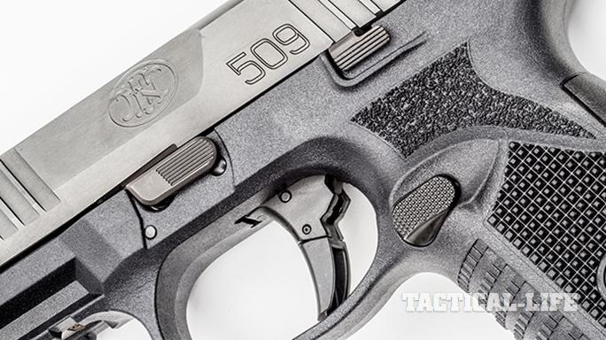 FN engineers did, however, manage to include four passive safeties in the 509’s design. There is a striker block that prevents the striker tip from protruding through the breech face unless the trigger is pulled. The drop safety prevents the sear from moving out of engagement with the striker unless the trigger is deliberately pulled, and the trigger disconnect safety is actuated when the disconnect cam is pushed out of alignment with the sear, preventing it from releasing the striker. This prevents the gun from firing when the slide is out of battery.
