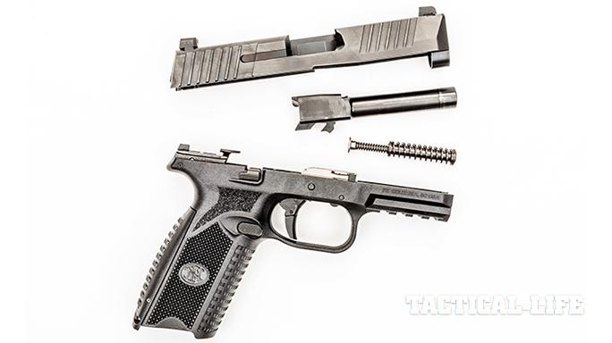 The starting point for this new pistol was the FNS Compact—a striker-fired, polymer-framed pistol. This gun provided the basic architecture. During its development, FN made several changes to the frame, barrel and slide. FN redesigned other components to meet the military requirements for increased reliability, accuracy and ergonomics.