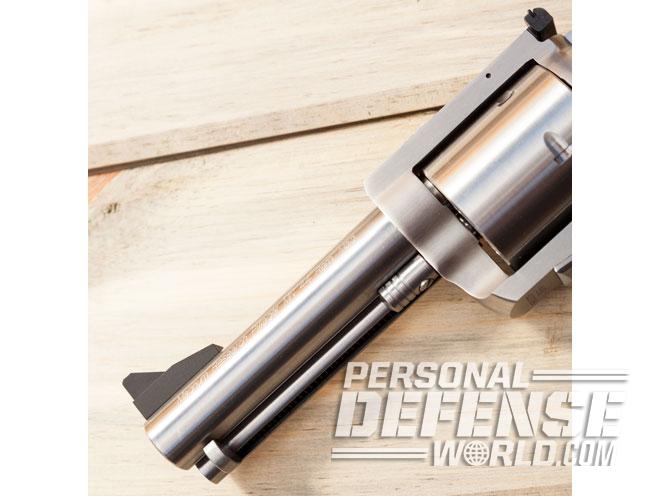 The BFR is a single-action revolver featuring a safety bar that rises to transfer the hammer’s energy to the frame-mounted firing pin whenever the gun is manually cocked. Once all five chambers are loaded, you can make the gun safe to carry by using your thumb to prevent the cocked hammer from falling as you pull the trigger. Then, once the hammer has broken free of its cocked position, releasing the trigger while carefully lowering the hammer also lowers the transfer bar, rendering the gun safe from any sort of accidental discharge.