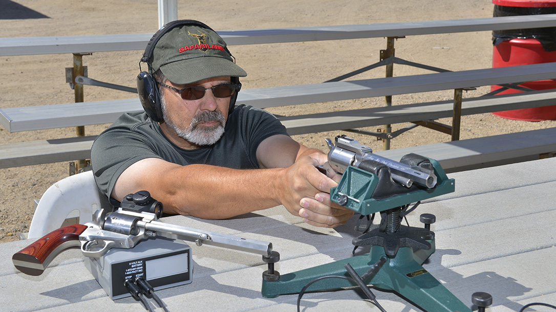 I tested both revolvers with one .45 Colt load—Hornady’s 185-grain Critical Defense FTX, which is rated for 920 fps—and two .454 Casull loads from CorBon: 240-grain JHPs with a rated muzzle velocity of 1,450 fps and 250-grain DPX rounds rated for 1,512 fps. My first task was to set up a chronograph and get some velocity data for both revolvers, and I immediately got a firsthand taste of the .454 Casull’s reputation for stout recoil.