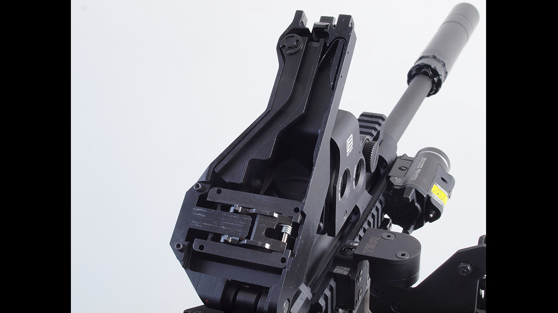 Each of these steel parts, as well as the bolt and trunnion, are made from heat-treated 4140 chrome-moly steel that has been nitrided for abrasion and corrosion resistance. They are attached with hex-head screws, not rivets or press fits, allowing for easy replacement. The barrel is also nitrided, which explains how one of the company’s test barrels still has serviceable rifling after firing 5,000 rounds over several full-auto sessions.