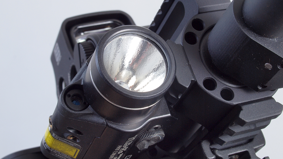 This weapon- mounted laser/light has a max output of a blinding 800 lumens, which can easily illuminate targets within the 50- to 125-yard range in which the FM-9 would typically be used. I mounted the TLR-2HL off the bottom rail near the muzzle and attached a remote pressure switch to the left side of the spade grip. I have used a similar Streamlight and like the easy mounting mechanism, the rocker switch for momentary or constant-on modes, and the toggle that activates the light, laser or both. It also has a low 60-lumen setting and can be programmed to strobe. As you can see, that’s a lot of features in a package this small. (streamlight.com)
