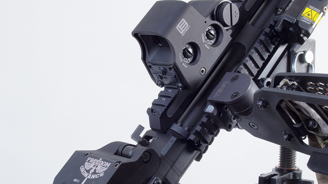 Freedom Ordnance makes two models of the FM-9: the Minimalist and the Elite. The latter is upgraded with a quad-rail forend and a quick-detach barrel mount. The company offers three barrel lengths for the Elite—6, 11 or 16.5 inches—making it work with rifles, SBRs and pistols with arm braces. Every barrel has 1-in-10-inch-twist rifling and 1/2×28-tpi threading at the muzzle, and A2-style flash suppressors are included. The barrel’s quick-change mechanism is reminiscent of the M249 SAW’s and works just as easily. To remove the barrel, press a lever on the trunnion, rotate the barrel a quarter-turn clockwise (using the carry handle to avoid a burn) and pull it forward.
