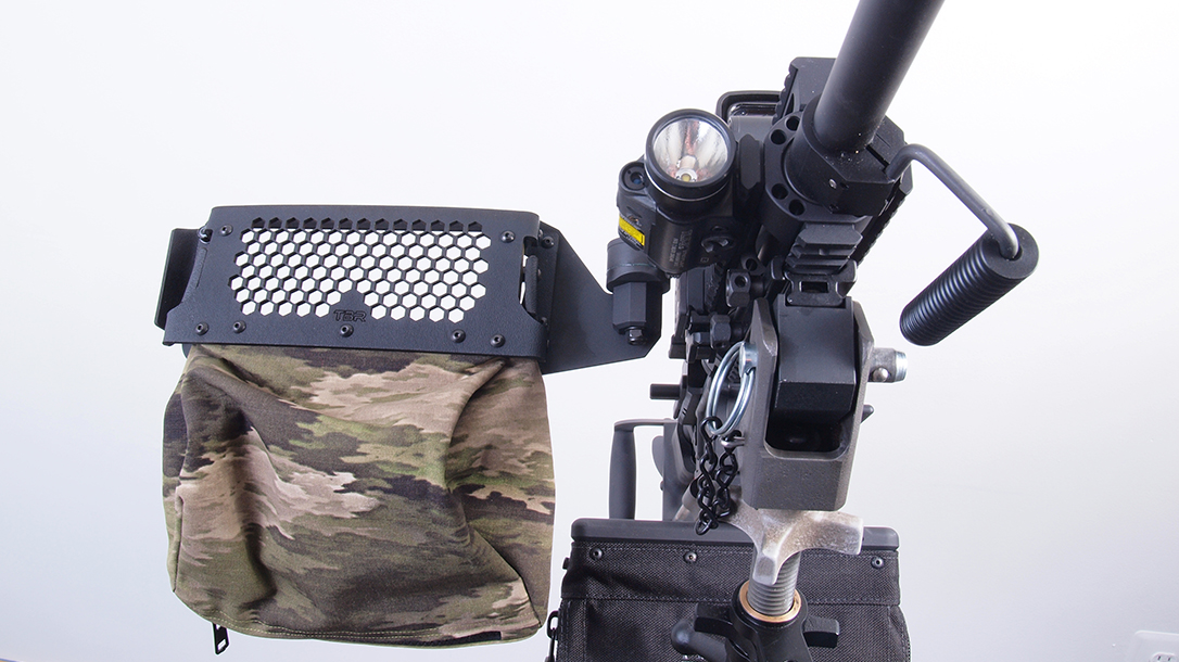 The catcher for the FM-9 mounts to the right-side rail with a throw lever for quick mounting, and it’s hinged so you can swing the recovery bag into place for use or out of the way for accessing the ejection port. The catcher’s anodized aluminum cover has multiple holes that do not contain or redirect firing gases and allow visual inspection of the ejection port. Brass and links are emptied from the bottom of the canvas collector bag with a zipper. (tacticalbrassrecovery.com)