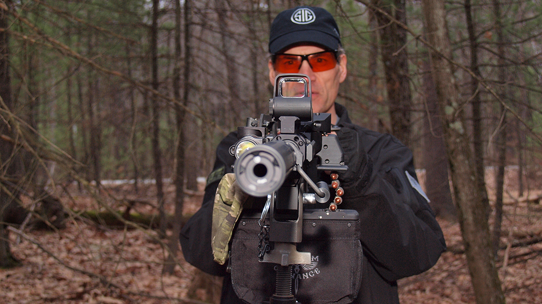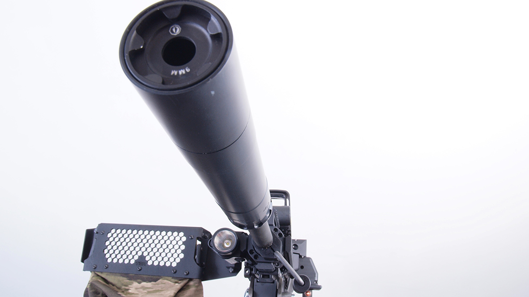 Why have a belt-fed gun without a belt-fed-rated suppressor? Rugged makes several suppressors that come with the company’s signature guarantee of being durable enough to withstand the sustained fire of a belt-fed full-auto. The multi-caliber Obsidian is for typical pistol cartridges and subsonic 300 BLK ammo. It is also configurable into short and long lengths. It uses hardened 17-4 stainless baffles to hold up during sustained fire. Though the Obsidian has a .45-inch bore, it can be used on a 9mm, and Rugged’s 9mm end cap might lend slightly better sound reduction than the .45-caliber cap it comes with. (ruggedsuppressors.com)