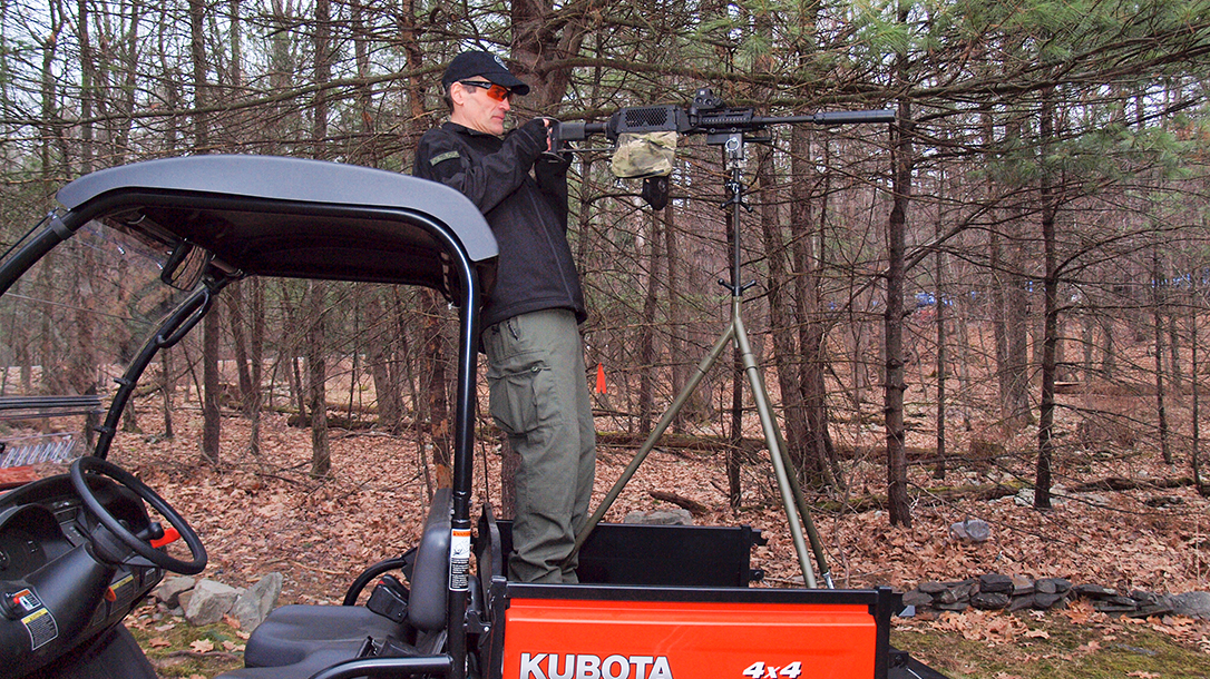 Because the spade grip necessitates firing from a support, I attached the new Firestorm Works Tripod. Sturdy and well made, this tripod comes in a military-style shoulder bag for easy field carry. It attaches to the FM-9’s forward Picatinny rail and uses a large pull pin to secure it, making mounting and removal of the rifle quick and easy.