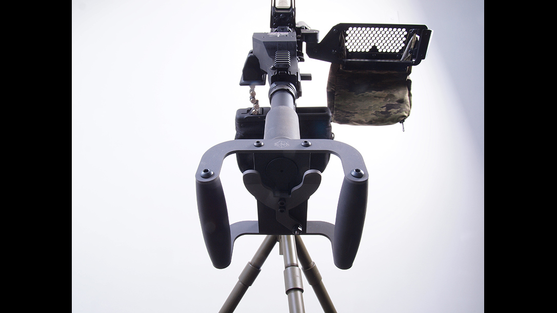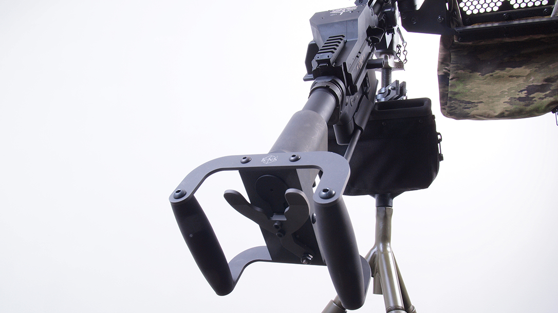 This KNS grip changes the shoulder-fired AR-15/M16 to a tripod- or bipod-mounted weapon. With the spade grip and a butterfly paddle-style trigger attached, the AR looks more like a Browning M2. Installing the spade grip is simple and does not require gunsmithing, and the rifle easily switches back to its shoulder-fired configuration later if needed. (knsprecisioninc.com)