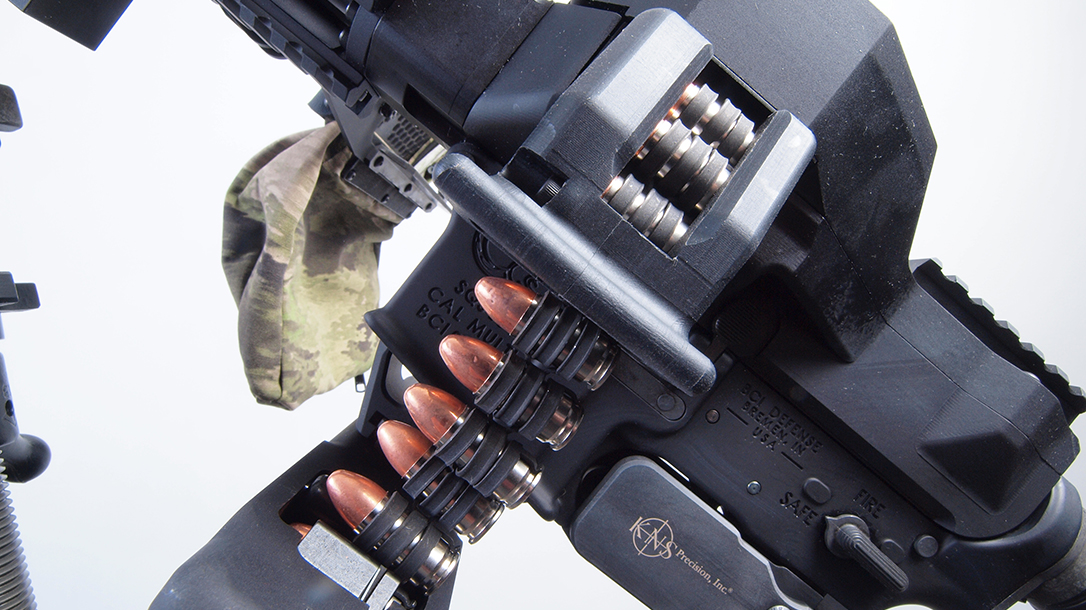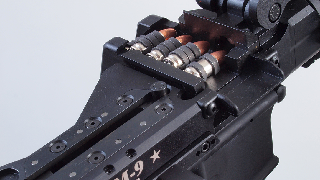 The FM-9 works with mil-spec AR-15/M16 lower receivers without any modification. The FM-9 is blowback operated, fires from a closed bolt and feeds from a disintegrating link belt housed in a nylon bag under the gun. The reusable links are made of heat-treated steel, and the detachable ammunition bag holds 150 rounds. You can fill those links by hand. However, buying the belt linker, which loads 15 at a time, is money well spent.