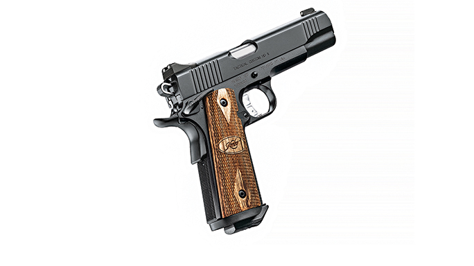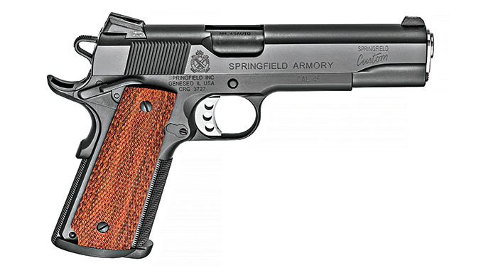 Springfield Professional 1911-A1: Custom built to Springfield Armory’s highest standards, the Professional includes a custom-fit slide, a National Match frame, a custom-fit fully throated match barrel and bushing, a polished feed ramp, a tool-steel match hammer and sear, a fitted speed trigger with a 4.5-pound pull, a lowered and flared ejection port, a checkered flat mainspring housing, a custom beavertail grip safety, an ambidextrous thumb safety, low-mount tritium night sights, a custom magazine well matched to the bevel of the frame and a full carry bevel to round out all edges for a smooth draw.