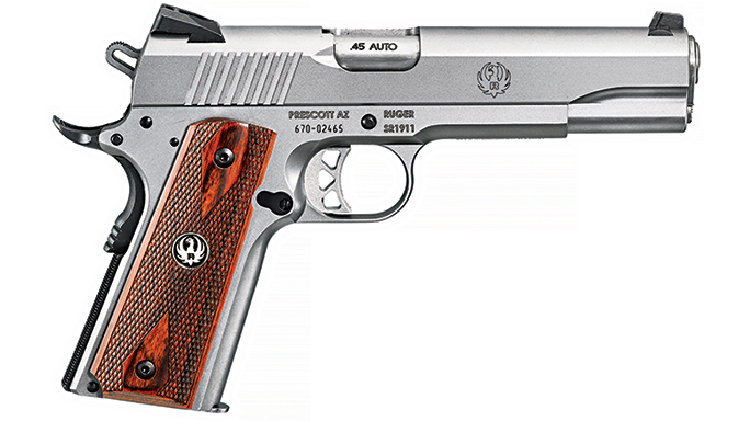 Ruger SR 1911: The 1911 design has inspired countless modern variations and among the very best and most affordable is the Ruger SR 1911. Essentially a Government Model right down to the early-style flat mainspring housing, the Series 70-based SR 1911 offers custom features including an extended beavertail safety, a skeletonized aluminum trigger with overtravel adjustment, skeletonized hammer and 8+1 capacity. The thumb safety, mainspring housing, beavertail safety and slide release are finished in a matte blue/black, contrasting the matte stainless slide and frame.