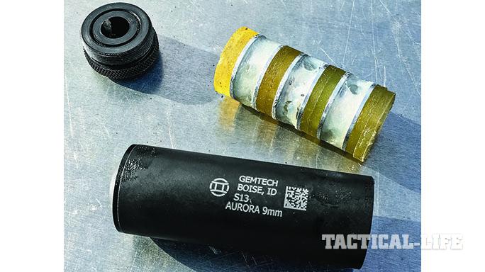 The Gemtech Aurora is a mere 3.3 inches in length and 1.13 inches in diameter, and it weighs 3.2 ounces. Internally, the Aurora has eight neoprene wipes that are tightly packed in the tube with aluminum spacers between each wipe. The wipes are coated with lithium grease when the Aurora is “packed.” The size and light weight of the Aurora eliminates the need for a booster or Nielsen device. The Aurora can also be serviced and repacked in the field by the end-user in a matter of minutes. However, the BATFE considers the internal wipes and spacers to be suppressor components, making them controlled items for civilian users. This limits the Aurora’s use by all but the most dedicated NFA enthusiasts.