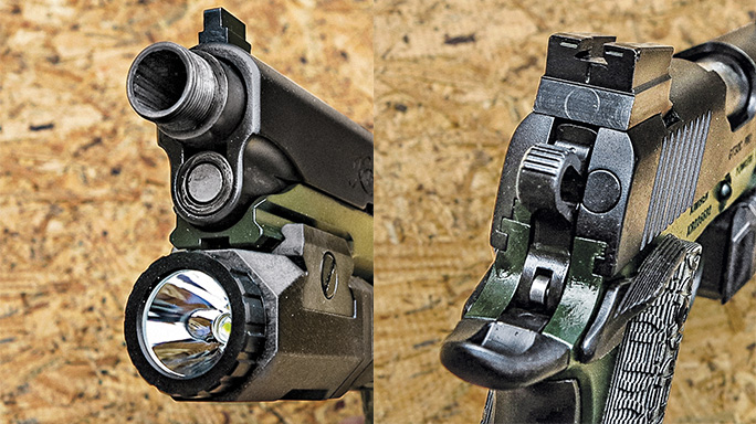 The GTSOC Pro is replete with features you would expect on a high-end tactical 1911, except for serrations on the front of the slide. These include an ambidextrous safety, 24-lpi checkering on the frontstrap and mainspring housing to give the shooter a secure grip, a Picatinny accessory rail for lights and lasers, and an enlarged magazine release. Instead of a traditional barrel bushing, the GTSOC Pro uses a barrel that is flared near the muzzle to mate it tightly with the front of the slide when the pistol is in battery. The 1911 also uses a full-length stainless steel guide rod.
