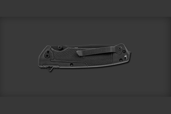 The blade has black ceramic coating which provides optimum corrosion resistance and minimizes reflective surfaces. The partial serrations provide additional cutting power, while the tempered steel glass breaker in the pommel allows for the knife to be used in rescue operations. The glass-filled nylon handle has a rubberized diamond texture for a firm, secure grip in any possible weather conditions. The handle also has a reversible pocket clip for tip-up or tip-down carry, and a lanyard hole.
