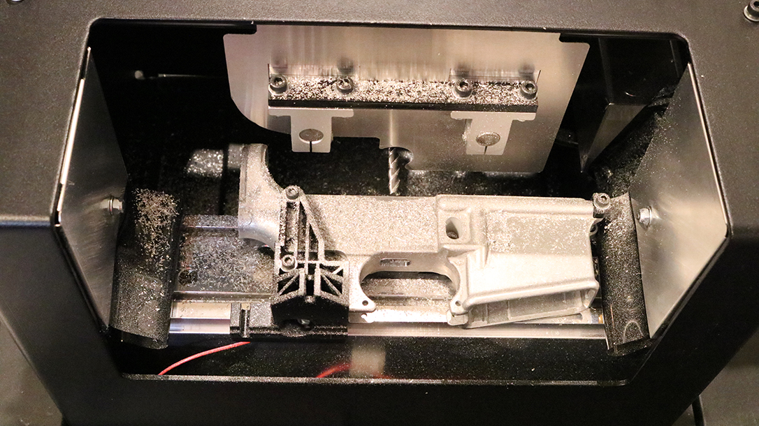 The machine is a wee bit noisy, but it’s an oddly pleasant sound. The Ghost Gunner sounds more like a Star Wars droid than an industrial machine. I cut my first receiver in my office. Put the machine on top of something to catch the chips, and it really doesn’t make a terrible mess.