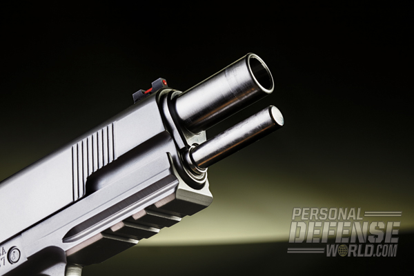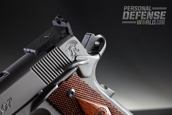 Instead of being staked, the plunger tube is part of the frame, making it as permanent as it gets. Another nice touch is an integral ejector. Again, this is part of the frame, not an added piece that needs to be staked or pinned. As a tactical pistol, the Gladiator includes a rail, but unlike most it includes three notches, not just one, allowing for just about any light (and even some of the new lasers) to mount up easily. There was no checkering on the front- and backstraps (though a fish-scale mainspring housing is now being offered to customers as an option free of charge). Everything on the frame is nicely melted and smooth. An extended slide stop is cut flush with the frame on the right side. This pistol has a single-side, tactical-style safety and a slightly extended magazine release. The trigger is a match aluminum design, and it broke cleanly. The grips are wood.