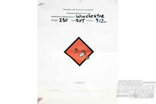 Holding the Gladiator, I found it to be very solid, which is not something I expected to achieve without checkering. The lip on the mag well really helps here, as does the high grip. My large hands help, as there is no space between the triggerguard and my little finger. Shooting it at 25 yards, I achieved some highly accurate results, with the best group measuring right at 1.5 inches using Winchester 230-grain Ranger SXT. The Gladiator proved accurate with everything it fired.