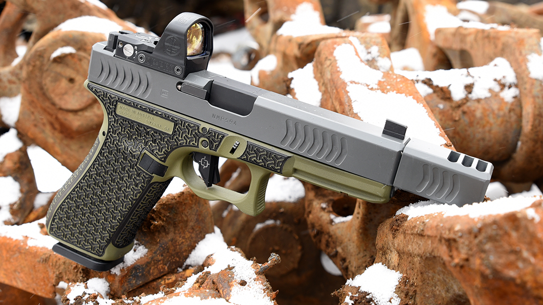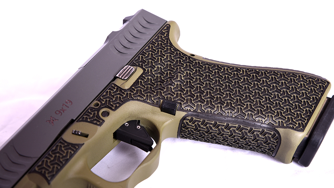 The hardest decisions I made regarded the frame’s laser stippling pattern and color scheme. I decided to get a Tetris laser stippling pattern on the frame, and then Cerakote’s new Elite Series Jungle finish to accent it. The slide was then given a durable Elite Series Concrete Cerakote finish.