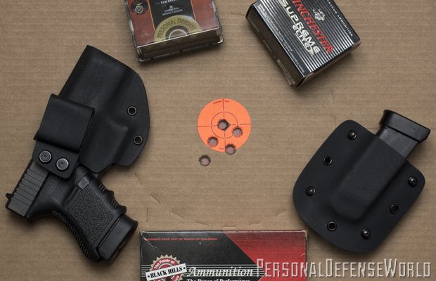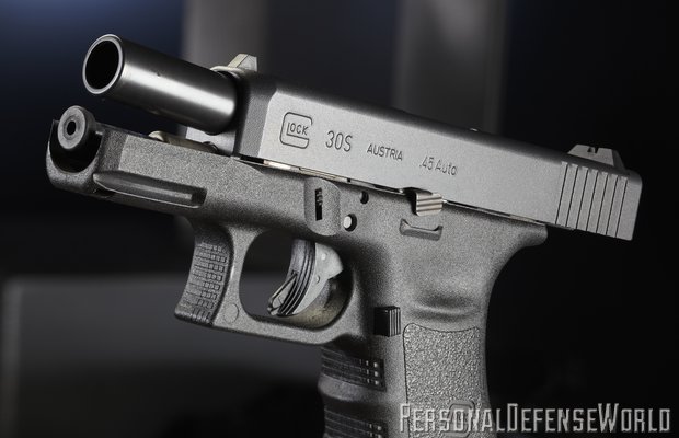 That leaves the Glock 30, which can usually be concealed well, carries ample large-caliber rounds (9+1 or 10+1) and adequately fits the hands of most shooters. Perhaps the Glock 30’s only drawback is that its slide is as thick as the Glock 21’s—1.27 inches. That is 0.09 inches thicker than the popular Glock 23’s slide, a difference that seems inconsequential until you slip either gun into an inside-the-waistband (IWB) holster. When stuffed inside the pants, where a pistol with most of the Glock 30’s dimensions should be right at home, every fraction of an inch in width can really count.