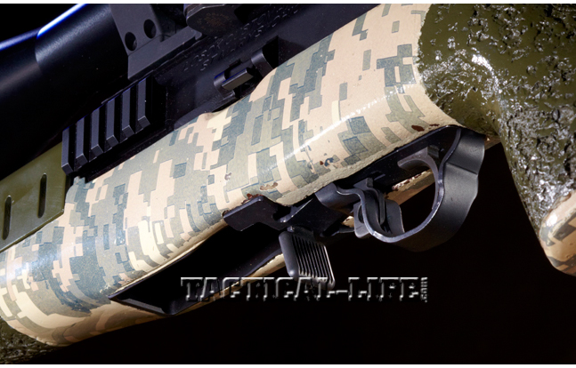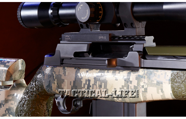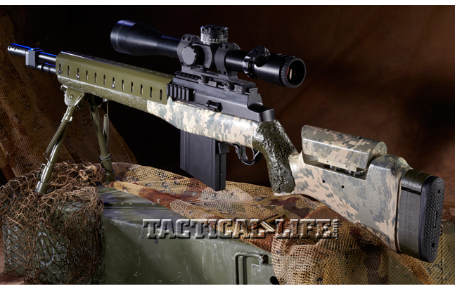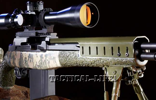 The stock on the 18.25-inch Valkyr is the same as that on the 24-inch version I originally shot—a McMillan M3 Adjustable M14 stock modified to fit the larger Valkyr. The McMillan stock has a standard length of pull, standard comb-height adjustments and a built-in Picatinny rail on the bottom of the forend. The stock has a green metal top forend half that blends in with the army digital camo pattern situated along the remainder of the rifle. The 18-inch version can also be had with a stock by Sage International.