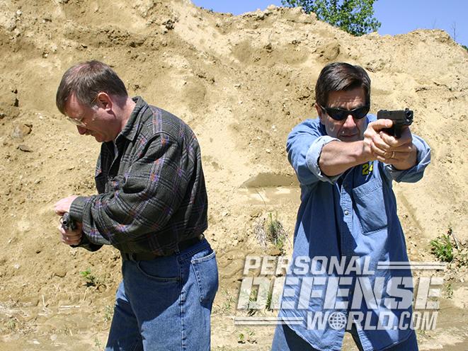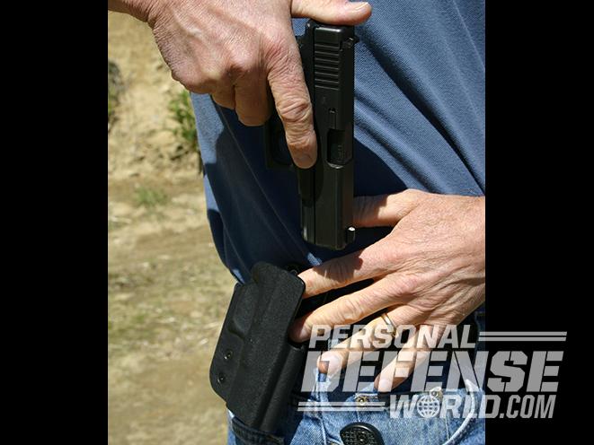 Lasering is not just an issue for bystanders—it’s also a major concern for shooters themselves. When drawing a gun or reholstering, never point the muzzle in toward your body. If you can’t get the gun into the holster without wiggling it back and forth, or using your support hand to hold it open, that’s a sure sign that you need a better-quality holster.