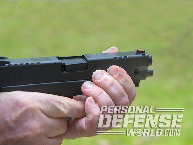 When checking to see if a semi-auto is loaded, some people use the “pinch” technique, which I find scary. This entails gripping the slide from underneath, just behind the muzzle, and pulling the slide back slightly in order to see if it’s loaded. If an accidental discharge happens, I don’t want my fingers that close to the muzzle. If you need to rack or pull back the slide, get into the habit of griping it from the rear of the pistol.