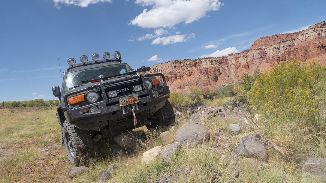 I live and work in the desert terrain of Utah. So I added an ARB awning to the driver’s side for some shade. My larger tires kept hitting the factory fender flares. I installed a set of Warrior Products tubular flares and took the Toyota FJ Cruiser back to Cruiser Outfitters for a “body mount chop.” This provides more travel for the tires by removing some metal from the front body mounts and welding on some plates for added strength. Oversized tires and Black Rhino hard wheels are heavy. So an Expedition One rear bumper with a swing-out tire arm made things more solid.