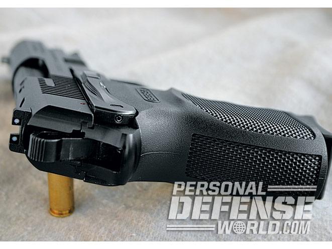 The DA trigger is long but smooth, with almost no take-up, and its pull measures about 12 to 13 pounds. In SA there’s a hint of take-up, then it breaks clean at about 5 pounds with little noticeable overtravel. A one-piece aluminum alloy frame has an integral accessory rail on the dustcover, and the triggerguard is hooked and serrated in front. With the exception of the disassembly lever and magazine, the controls are ambidextrous. The magazine release can be reversed for southpaws—it’s right behind the trigger just where U.S. shooters like it. The one-piece, black polymer grips are checkered on the sides and rear, plus the frontstrap on the grip frame has finger grooves and serrations.