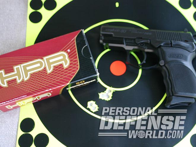 I had a beautiful day at the outdoor range I use, with just the right temperature and no wind. My first step was to chronograph the ammunition to get velocity readings. Step two was to set up my target stand at 15 yards for a practical accuracy evaluation. The Thunder 40 Ultra Compact Pro has a 3.25-inch barrel with conventional six-groove rifling and a 1-in-16-inch right-hand twist. Shooting was done using a sandbag rest from the bench with the pistol in SA mode. I shot three 5-shot groups with each brand of .40 ammunition. HPR came first, then HSM (both Practice and Duty loads) and finally the Winchester Ranger LE cartridges. The best group of the day was 1.41 inches with the HPR 180-grain JHP load. Winchester came in a very close second and HSM third. None of the group averages were over 3 inches, a testament to this little pistol’s accuracy potential.