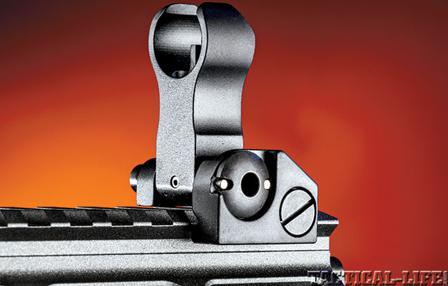 The flattop upper receiver is T-marked, which helps operators return zeroed optics to their proper place if they have been removed. Troy Industries diopter folding battle sights also come standard, and they stay neatly out of the way when using optics but deploy quickly when needed with push-button activation.