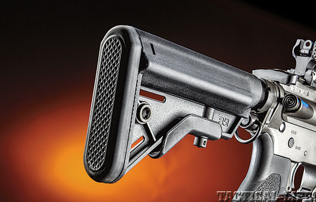 The B5 Systems SOPMOD Bravo collapsible polymer stock includes ambidextrous QD sling attachment points and encompasses a mil-spec 7075-T6 buffer tube. The receiver endplate has a QD sling point, and a small loop QD sling swivel is included. The tube is secured with a staked M4 lock nut, and the correct-weight H-marked buffer rides inside. Heavier buffers offer distinct advantages—they slow down the bolt and bolt carrier travel to ensure proper case extraction and keep the internal parts from slamming into each other with as much force. This also reduces the recoil signature.
