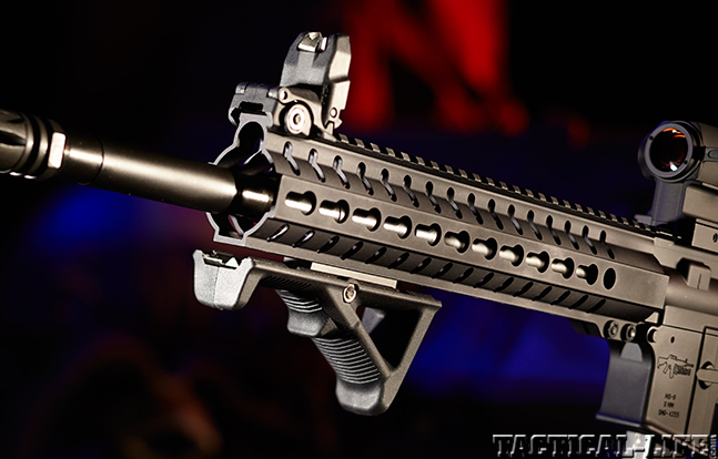 One of the first things that you notice about the Mk4 T platform is the free-floated forend. It is topped with a full-length Picatinny rail that mates up with the Picatinny rail on top of the upper receiver. However, on the bottom and sides of the forend are KeyMod slots. The KeyMod system is a relatively new interface method that allows users to attach lights, grips, lasers and all of their favorite toys while keeping the rifle weight lower than it is when decked with Picatinny rails. This development is taking the AR rifle industry by storm. Forends can now remain more compact and snag free. Attachments now protrude less. And it’s still compatible with all Picatinny-style attachments by simply KeyModding a Picatinny rail into place where needed.
