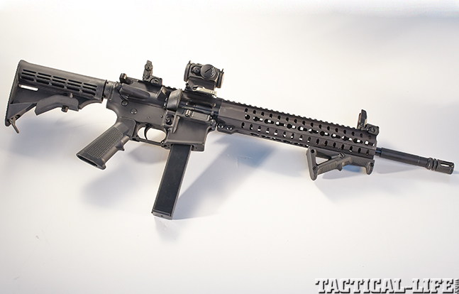 After the accuracy testing, I got to play. Performing moving-and-shooting drills, reload drills and box drills was nothing but fun. ARs in 5.56mm NATO do not kick much, but 9mms are truly a pleasure to shoot. Whether it is because of less recoil or less noise or less muzzle blast I am not sure. I just know everyone who runs one of these never wants to put it down. Even with the chamfered magazine well, I found I was a little slower inserting magazines than with a regular 5.56mm magazine. Then I started treating the reloads more like the gun was a pistol. After dropping out the empty mag, I rolled the gun outboard and bought it up toward my face. I could clearly see the bottom of the mag well. Sliding the magazine home became much faster and smoother. In no time I was able to make very fast and easy magazine changes while stationary and on the move.