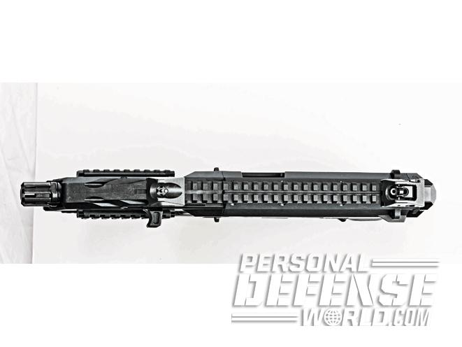 With the PRES cheekrest adapter, an empty 30-round magazine and the Crimson Trace Rail Master Pro installed, the pistol tips the scales at 6.5 pounds, while it weighs only 5 pounds when completely stripped.