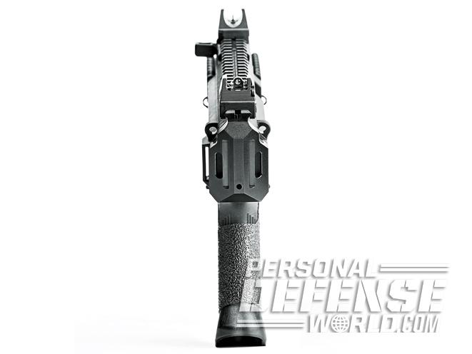 The small, curved polymer charging handle is installed on the top-left side of the receiver and just forward of the magazine, similar to an HK MP5. Likewise, it features a locking tab to keep the bolt open and is non-reciprocating. It is, however, reversible and can be installed on the right side of the receiver for left-handed operation. It can also be used to release the bolt, which stays to the rear after the last shot. Alternatively, the operator can use the left-side bolt catch/bolt release lever, which can also be engaged with the left hand’s thumb when inserting a magazine.