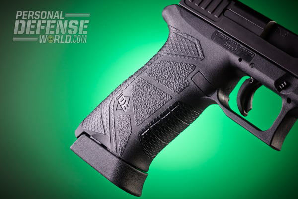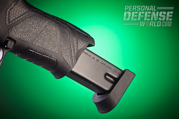The gun’s controls are similar to those of a Glock, with a single slide stop on the left side. The magazine release is easily accessed.
