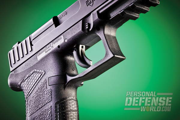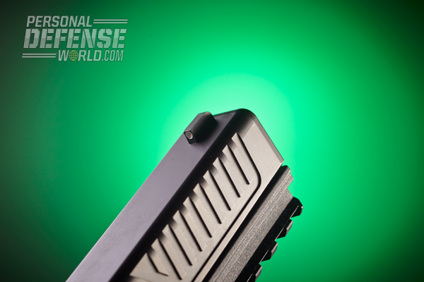 Indentations at the bottom of the mag well allow you to “pull” on the magazine base to ensure it is properly seated. The square triggerguard sits behind a full-length rail with multiple slots. Every light in my inventory went on easily, including several SureFire lights, some Streamlights and a few others. The Melonited, Glock-style sights are made OEM by Ameriglo—a nice touch. The front is bolted on, while the rear uses a dovetail, and both have prominent white dots.