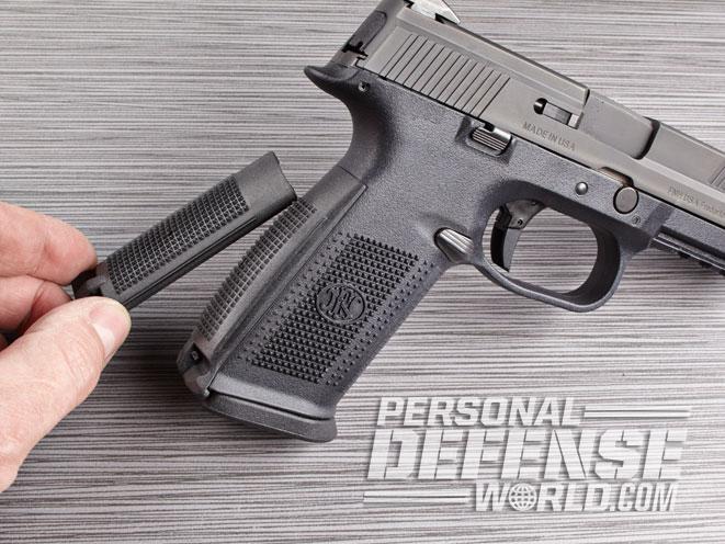 The FNS-9 Longslide comes with three 17-round magazines and interchangeable backstraps. Note the ambidextrous mag and slide releases.