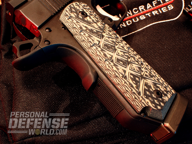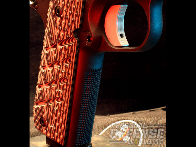 The 20-lpi checkering on the frontstrap and mainspring housing, coupled with the aggressively textured and deeply relieved G10 Shredder grips ensured a rock-solid grasp on the gun. This, combined with the undercut triggerguard and upswept beavertail, contributes to control and a reduction of muzzle flip, as does the front-heavy, recoil-dampening bull barrel. If a shooter finds these grips too thick and/or abrasive, the aforementioned GI Alumagrips may be used. These are comfortable while providing plenty of traction.
