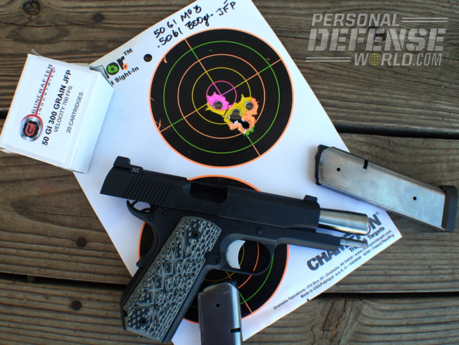 The gun handled beautifully. It is very ergonomic in the hand due to the custom touches that let you obtain a high grip, and the pistol was quite comfortable to shoot. Despite the big, scary caliber, shooters will be pleasantly surprised to find that Alex achieved what he set out to do—a practical defensive pistol with a .50-caliber round. There is no punishing recoil with slow recovery times before the sights settle back on target. The 185-grain CHP load recoils about as sharply as a .45 ACP +P and less than a 10mm. This is due to the large caliber and low working pressure of the .50 GI cartridge. The heavier loads, like the 300-grain JFP, give about the same impulse as a 230-grain .45 ACP. This sort of handling is entirely appropriate for a combat pistol.