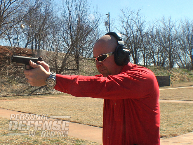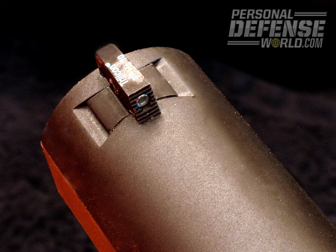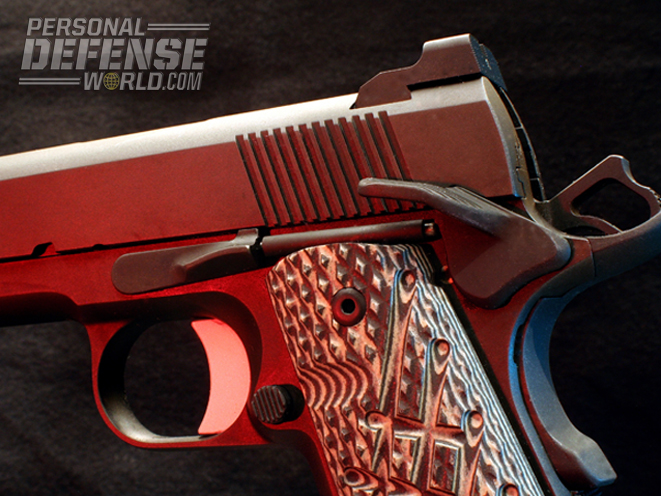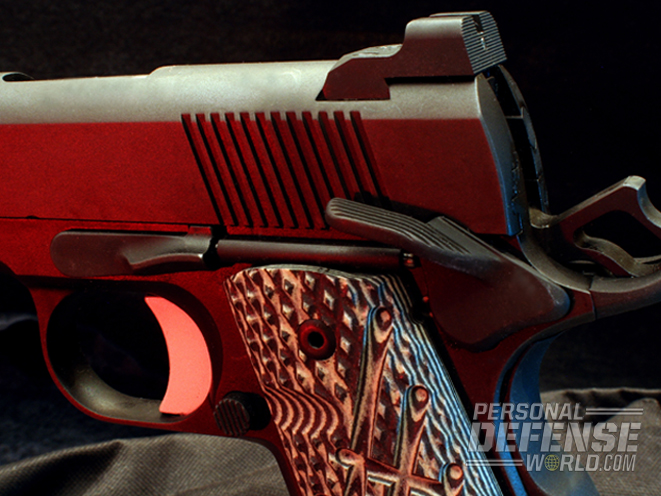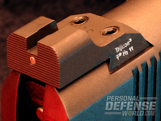The beavertail disengaged consistently, even though I take a high hold on the thumb safety. The Heinie sights afforded a pronounced, wide front blade and a large, squared rear notch, making them fast and easy to pick up with the eyes. I prefer the Straight Eight night sight system, as it is very fast in low light.