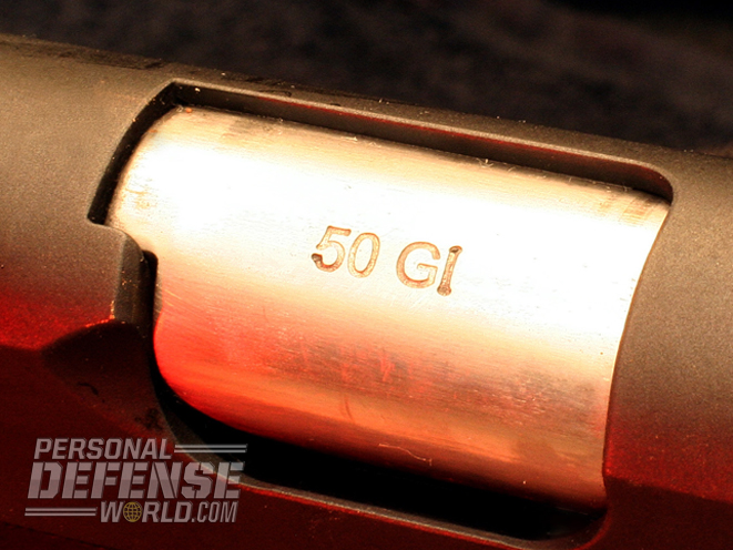 The heavy, match-grade, 4.25-inch barrel is cut from a rifle-quality 416R stainless steel forging. The barrel features an 11-degree crown and 1-in-16-inch, right-hand twist rifling. It’s also a bull barrel, meaning it has a full 0.75-inch diameter at the chamber and muzzle and mates directly to the slide, dispensing with the traditional 1911 bushing. The chamber hood is marked “.50 GI.”