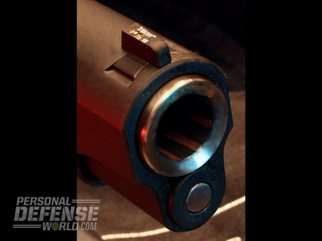 As already touched upon, the Model 3, released in 2010, is a Commander-length 1911, albeit chambered in the larger .50 GI round. One quick look reveals that the pistol has an outstanding fit and finish, with a Bobtail frame and a matte-black exterior. Those unfamiliar with these .50 GI pistols might be surprised upon hefting them, as the their outside dimensions are the same as those of traditional 1911s. And at just 35 ounces, it is light as well! The bobbed frame is machined from a 4140 chrome-moly forging and treated to a carry bevel. Other than its bobbed contours, there’s not a lot different about the dimensions of the frame other than the fact that the magazine well opening is wider, the feed ramp is huge and the bevel on the well is narrower to accommodate the larger canal. Custom features include 20-lpi checkering on the frontstrap and what appears to be 30-lpi checkering on the mainspring housing, while the bobbed contour is smooth. An undercut eliminates the excess metal from under the triggerguard, which, in conjunction with the flawlessly blended, memory-bump-equipped beavertail grip safety, facilitates a high hold. The single-sided, modestly extended thumb safety bears serrations on its pad, and the smooth-contoured slide lock, machined from bar stock, has also been slightly extended. The mag release is slightly raised and serrated.
