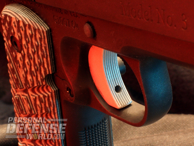 If you’re familiar with the 1911, this gun feels exactly like (and shoots like) the 1911 with its unsurpassed ergonomics. All its outside dimensions remain identical to the 1911, and even the weight is the same. Holsters for standard 1911s will fit the Model 3. The excellent trigger gives a crisp break at 4.5 pounds after about 0.06 inches of play, with no overtravel. A superior trigger always makes a pistol easier to shoot accurately, and that was the case here.
