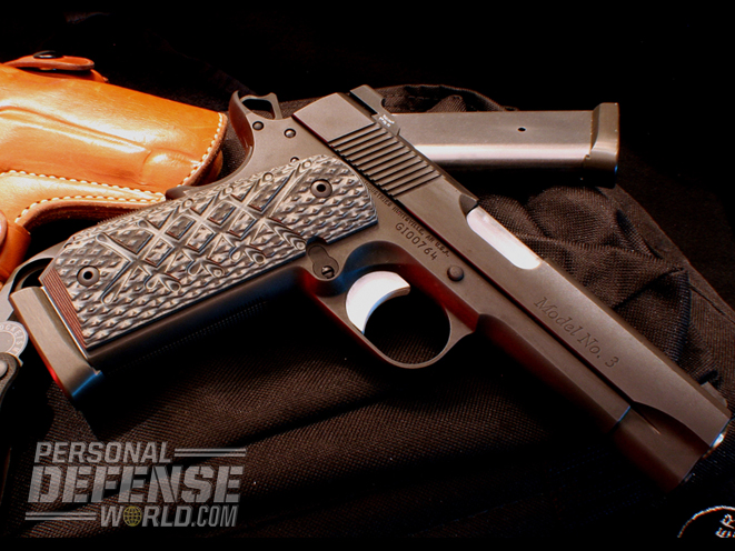 If you’re familiar with the 1911, this gun feels exactly like (and shoots like) the 1911 with its unsurpassed ergonomics. All its outside dimensions remain identical to the 1911, and even the weight is the same. Holsters for standard 1911s will fit the Model 3. The excellent trigger gives a crisp break at 4.5 pounds after about 0.06 inches of play, with no overtravel. A superior trigger always makes a pistol easier to shoot accurately, and that was the case here.