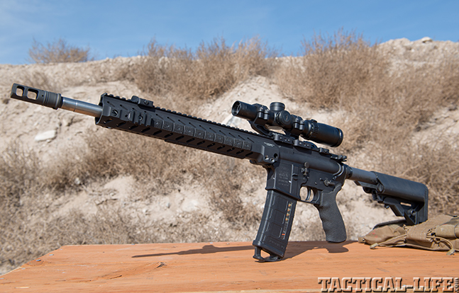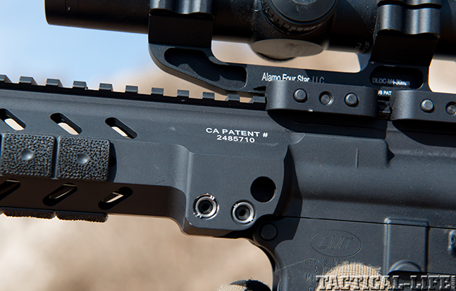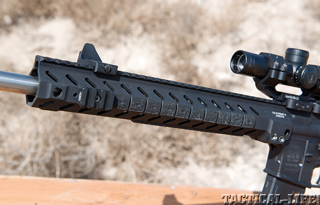 Within the handguard is a 16-inch, stainless steel, match-grade barrel with a 5.56mm NATO chamber and 5R rifling with a 1-in-7.5-inch twist rate. LMT’s standard bolt carrier group is used along with an LMP103T charging handle.