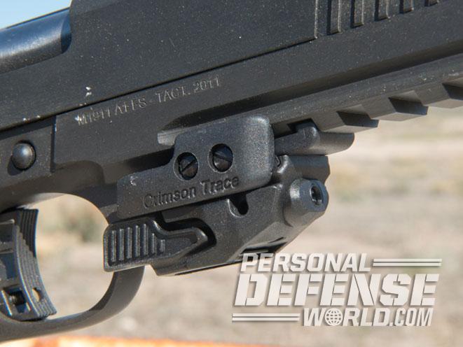 Lasers are becoming very popular, so a Crimson Trace Rail Master Pro Universal Green Laser Sight was attached for most of the testing. Being relatively small, it was easy to fit to the rail using the supplied plates. Situated for easy access with either hand, the laser fit snugly and did not move during testing. Having used green lasers at last year’s Crimson Trace Midnight 3-Gun event, I’ve found that they are a nice addition to any handgun. Green lasers tend to be much easier to see during the day as well, making them more versatile.