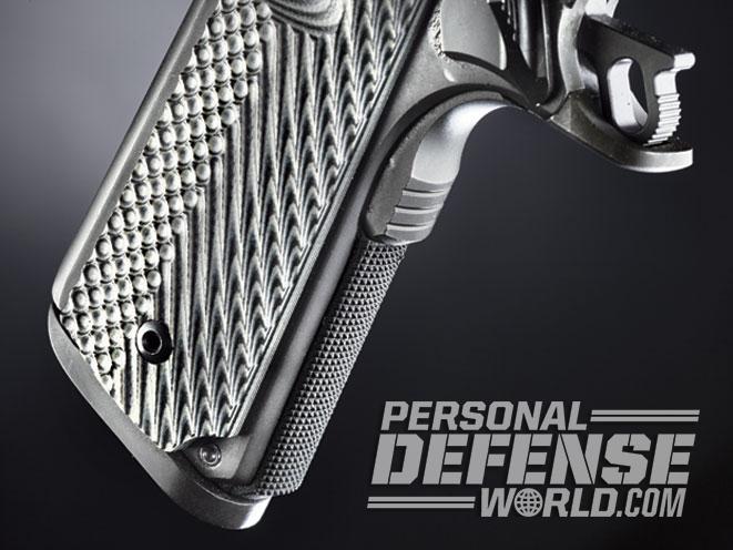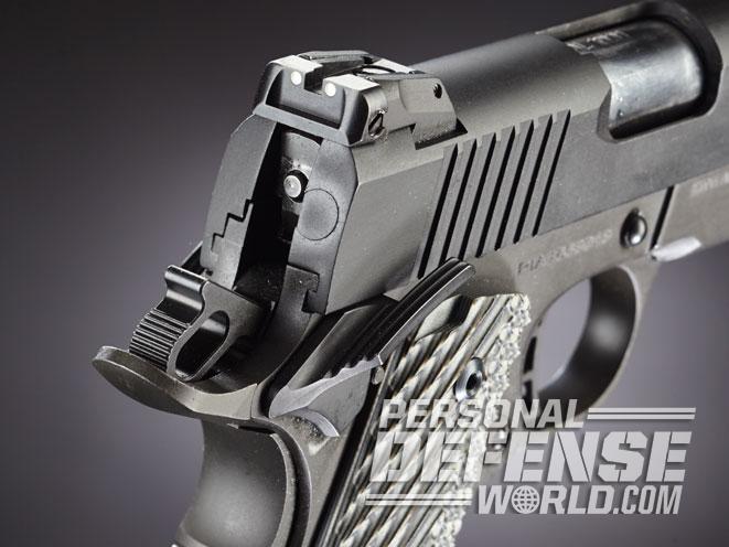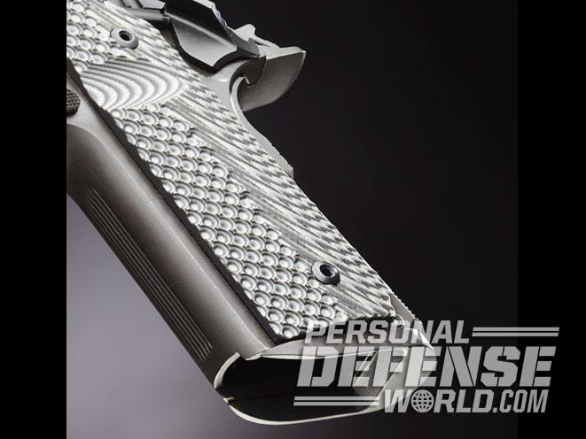 A smooth Parkerizing appears throughout with a pretty solid fit. There’s no rattle in the grip safety. Cocking serrations at both the front and back are evenly cut and the same size. Upon closing the slide, it locks nicely into place, engaging the safety; there is no movement. Both safeties were a bit sharp to suit me, as I would like to see them rounded a bit more. The G10 grip is also pretty sharp, but that’s the way many like it. The pistol locks nicely into place while shooting with gloves on.