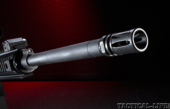 Both Delta versions utilize 16-inch, chrome-moly, heavy barrels with 1-in-9-inch twist rates. The heavier barrel profile provides more stiffness for potentially increased accuracy over the military’s M4-contour barrels. The barrel is capped with a removable A2 flash suppressor on 1/2×28 threads.
